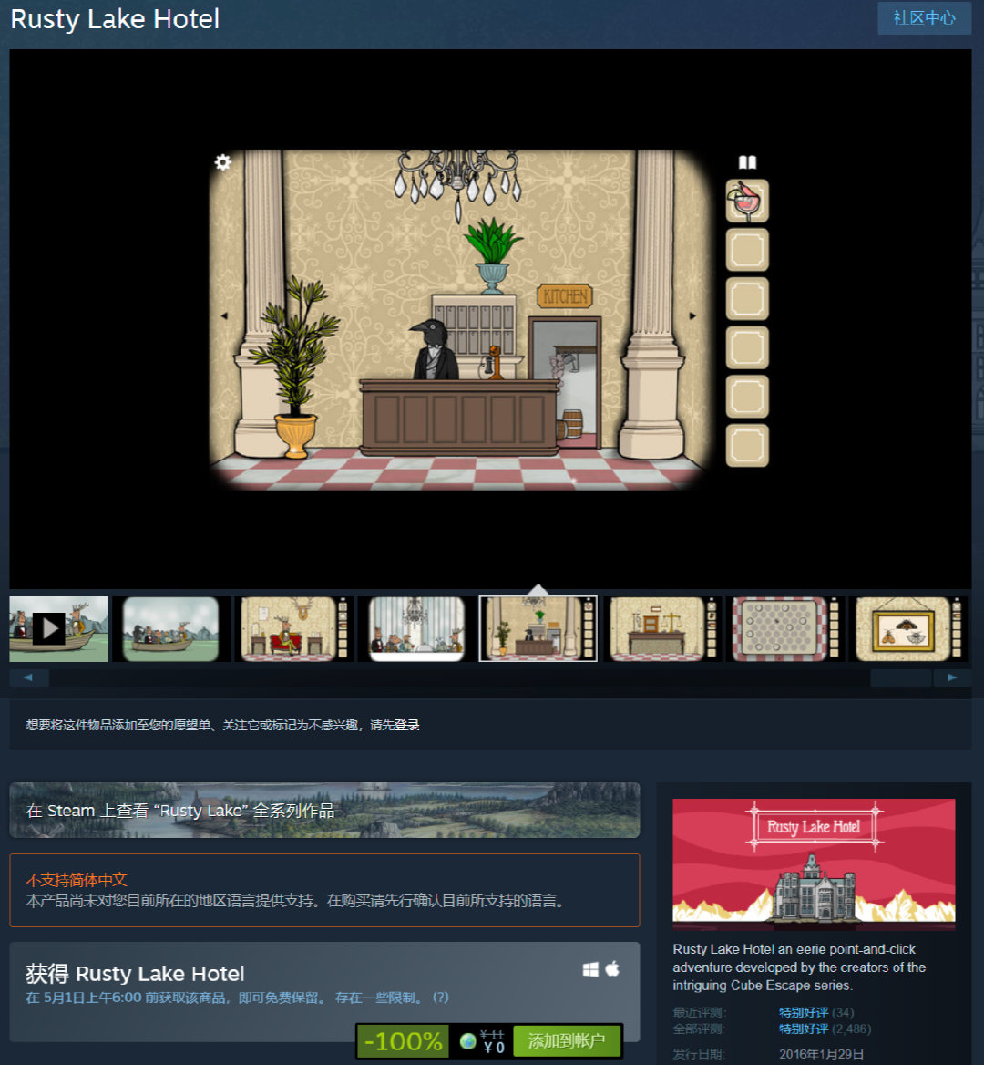 惊悚解谜游戏《锈湖:旅馆》现可在Steam上免费领取,领取后即可入库,5月1日上午6:00截止,原价11元。游戏已更新中文支持(虽然Steam页面显示无中文,但进游戏后有中文选项)。
