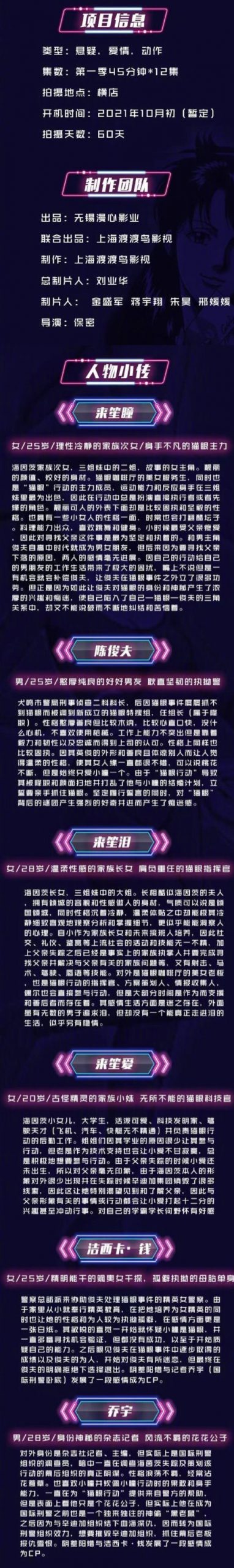 国产网剧版《猫眼三姐妹》确认将于10月开拍,第一季预计将有12集。